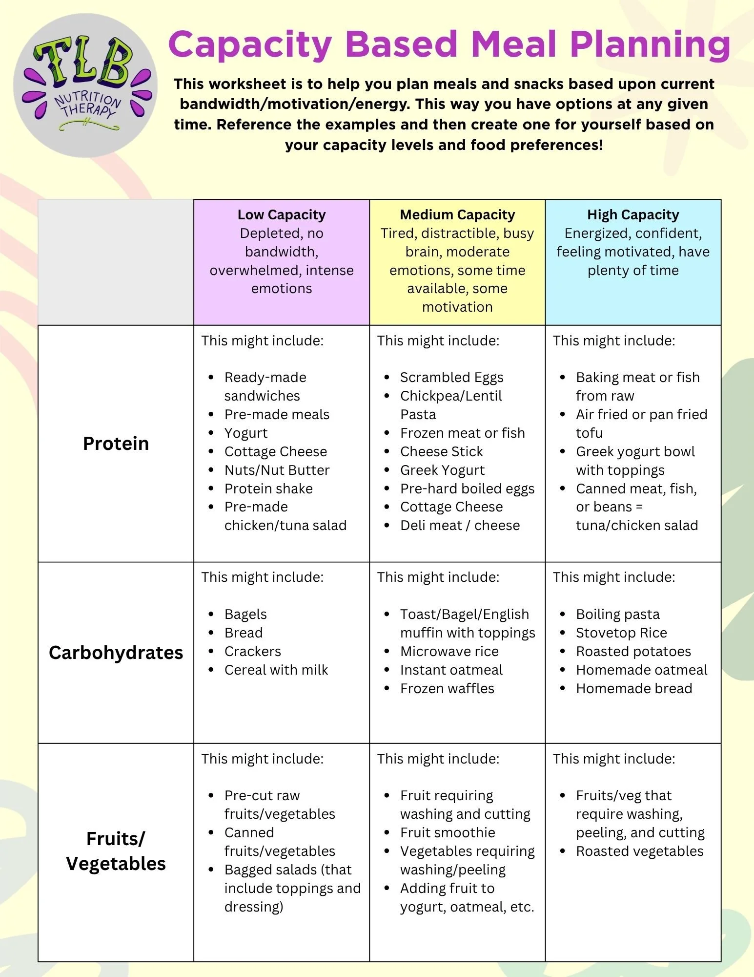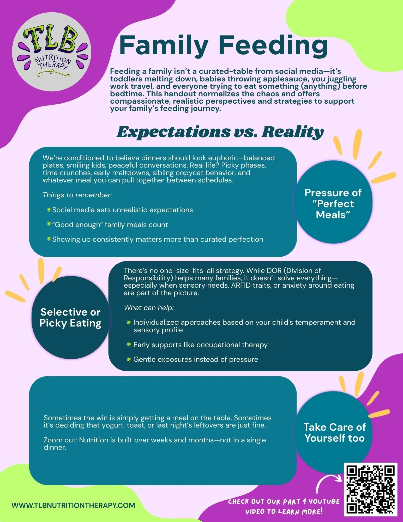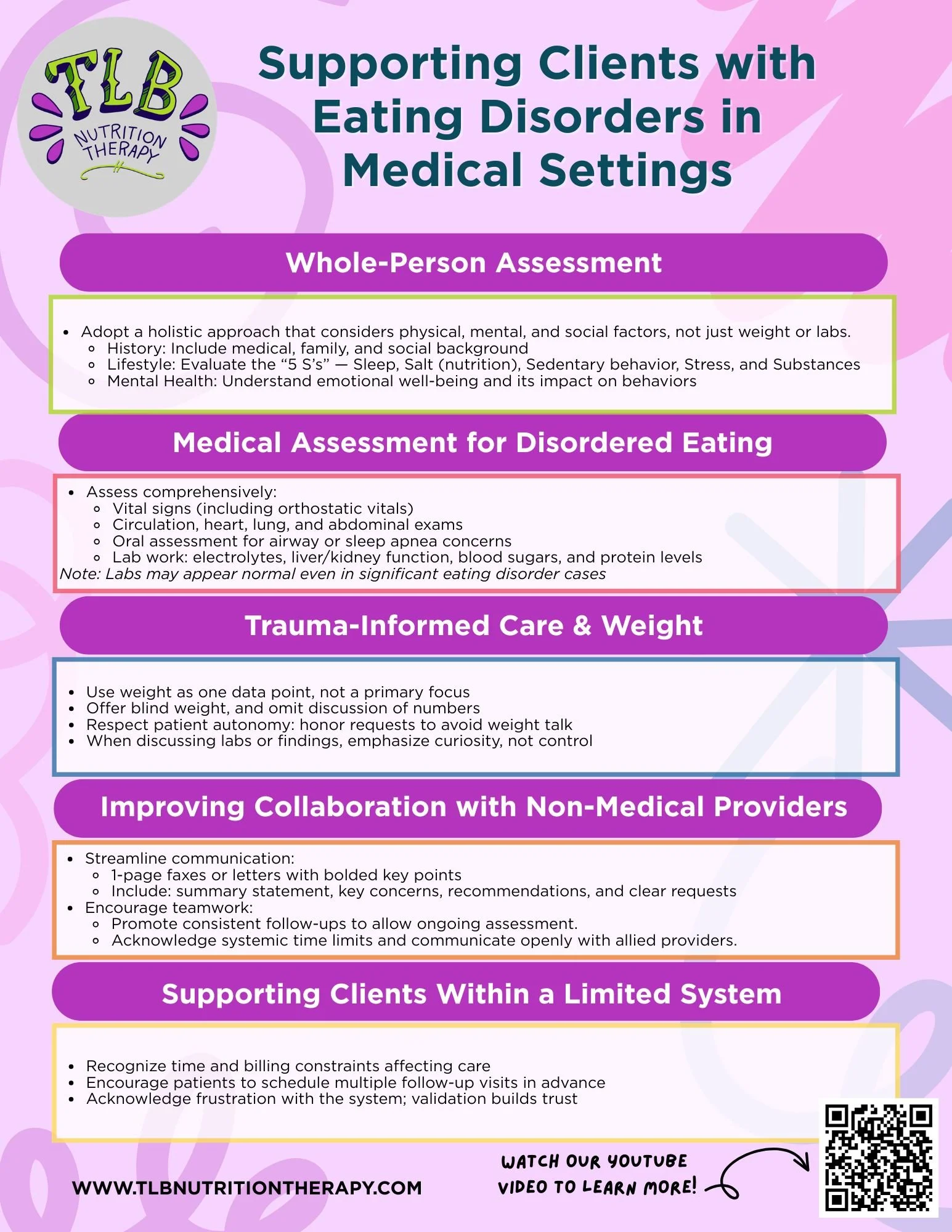 TLB Nutrition Therapy Handouts All of the handouts below have been created by TLB Nutrition Therapy. These are for education purposes only. For specific questions, please reach out to us directly. What to Expect in a Session Click Here for the Youtube Video Click Here for the Youtube Video How to Navigate Medical Visits Click Here for the Youtube Video Click Here for the Youtube Video What is Weight Inclusive Care Click Here for the Youtube Video Click Here for the Youtube Video Do Not Weigh Me Cards Click Here for the Youtube Video Click Here for the Youtube Video Intro to PCOS Click Here for the Youtube Video Click Here for the Youtube Video Sports Nutrition Coming Soon - Youtube Video Coming Soon - Youtube Video Supporting clients with Eating Disorders Coming Soon - Youtube Video Coming Soon - Youtube Video Supporting Kids with Their Food Relationship Click Here for the Youtube Video Click Here for the Youtube Video Halloween Candy: Buidling Trust Not Fear Click Here for the Youtube Video Click Here for the Youtube Video Capacity Based Meal Planning Youtube video coming soon! Youtube video coming soon! Life Tiers Click Here for the Youtube Video Click Here for the Youtube Video Levels of Recovery Click Here for the Youtube Video Click Here for the Youtube Video Hunger/Fullness Click Here for the Youtube Video Click Here for the Youtube Video What is a Carb? Click Here for the Youtube Video Click Here for the Youtube Video What is a Protein? Click Here for the Youtube Video Click Here for the Youtube Video What is a Fat? Click Here for the Youtube Video Click Here for the Youtube Video Supporting Your Child with ARFID Click Here for the Youtube Video Click Here for the Youtube Video What is ARFID Click Here for the Youtube Video Click Here for the Youtube Video Coming Soon!! Coming Soon Youtube Video Coming Soon Youtube Video Family Feeding:Part 1 Click Here for the Youtube Video Click Here for the Youtube Video Family Feeding:Part 2 Click Here for the Youtube Video Click Here for the Youtube Video Coming Soon! Click Here for the Youtube Video Click Here for the Youtube Video