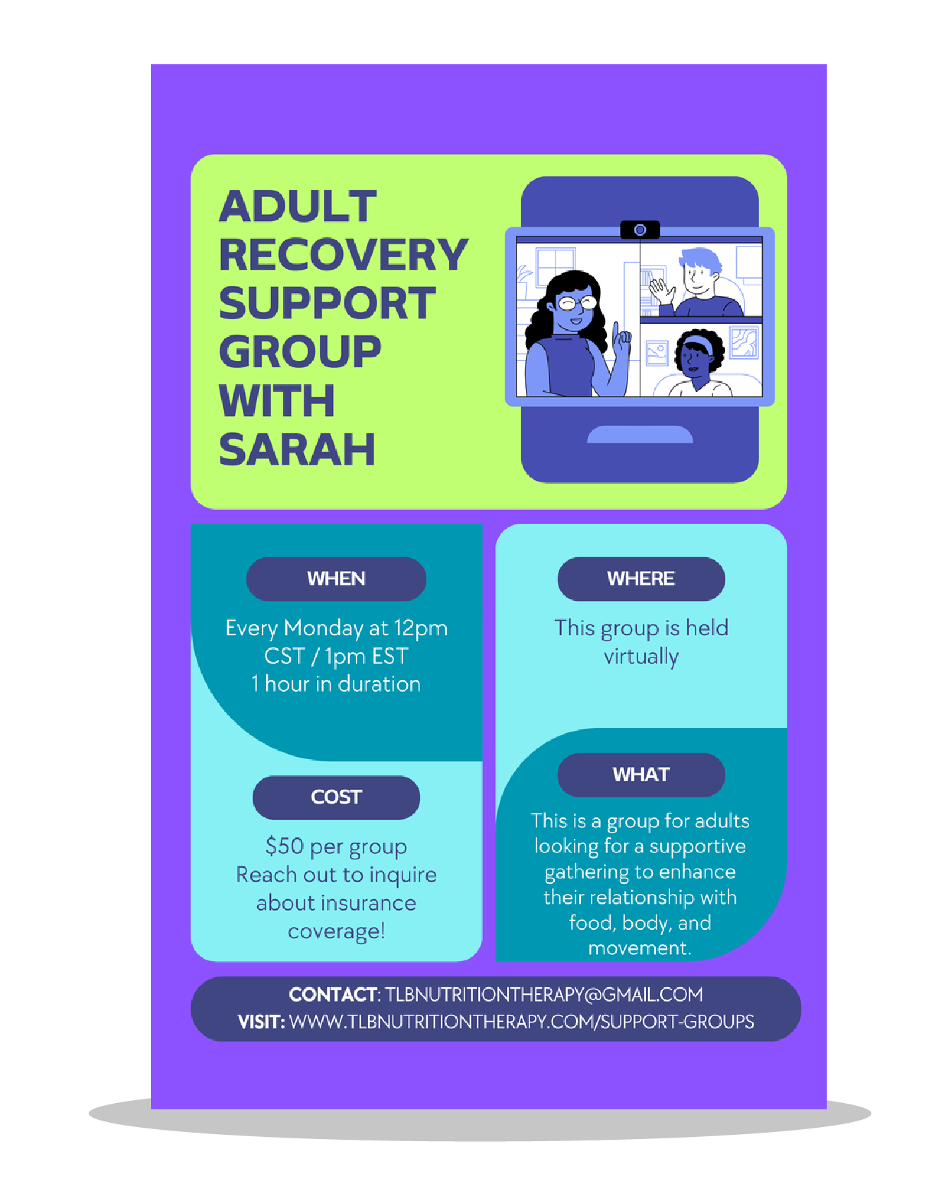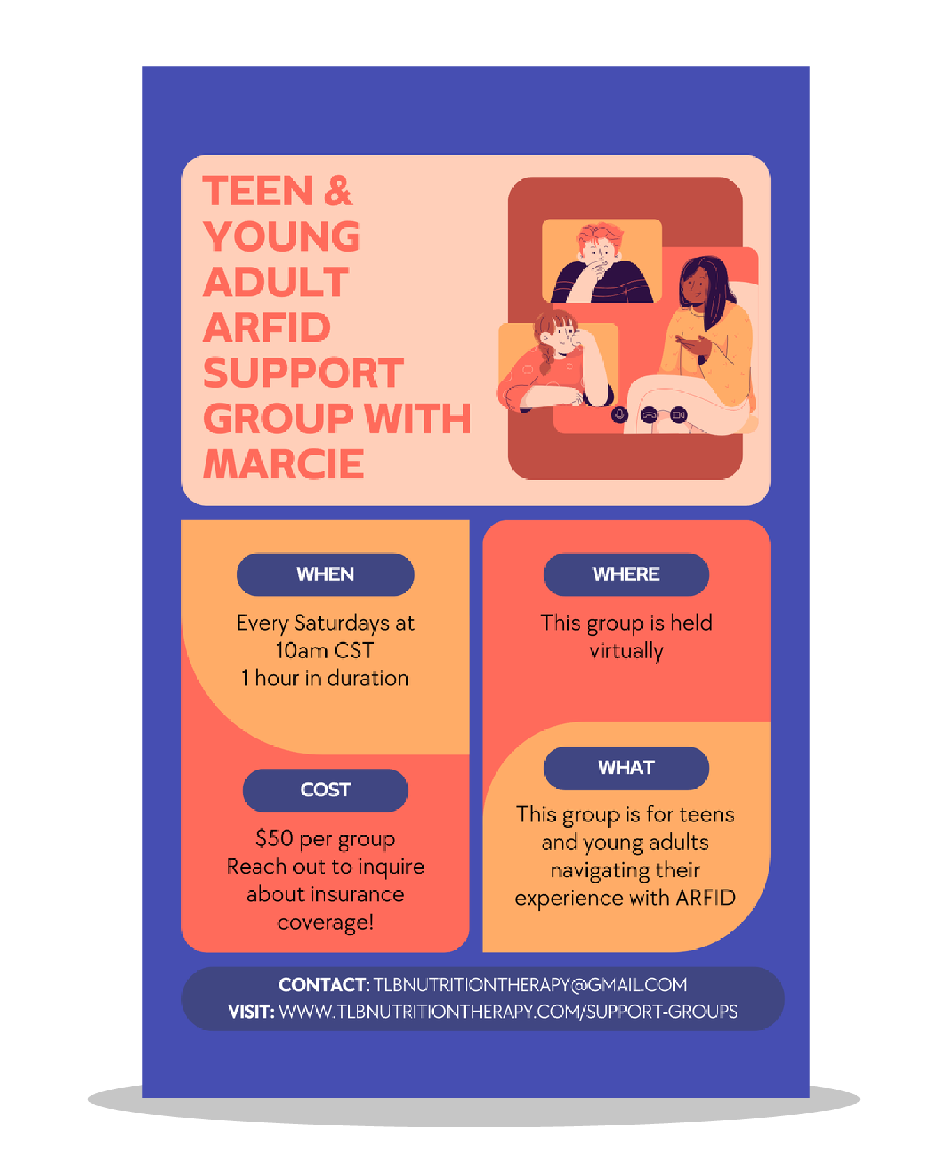 If you want to register for multiple groups, please reach out to Tina at TLBNutritionTherapy@gmail.com for more details.